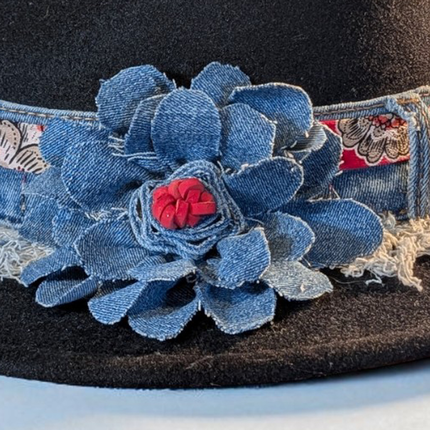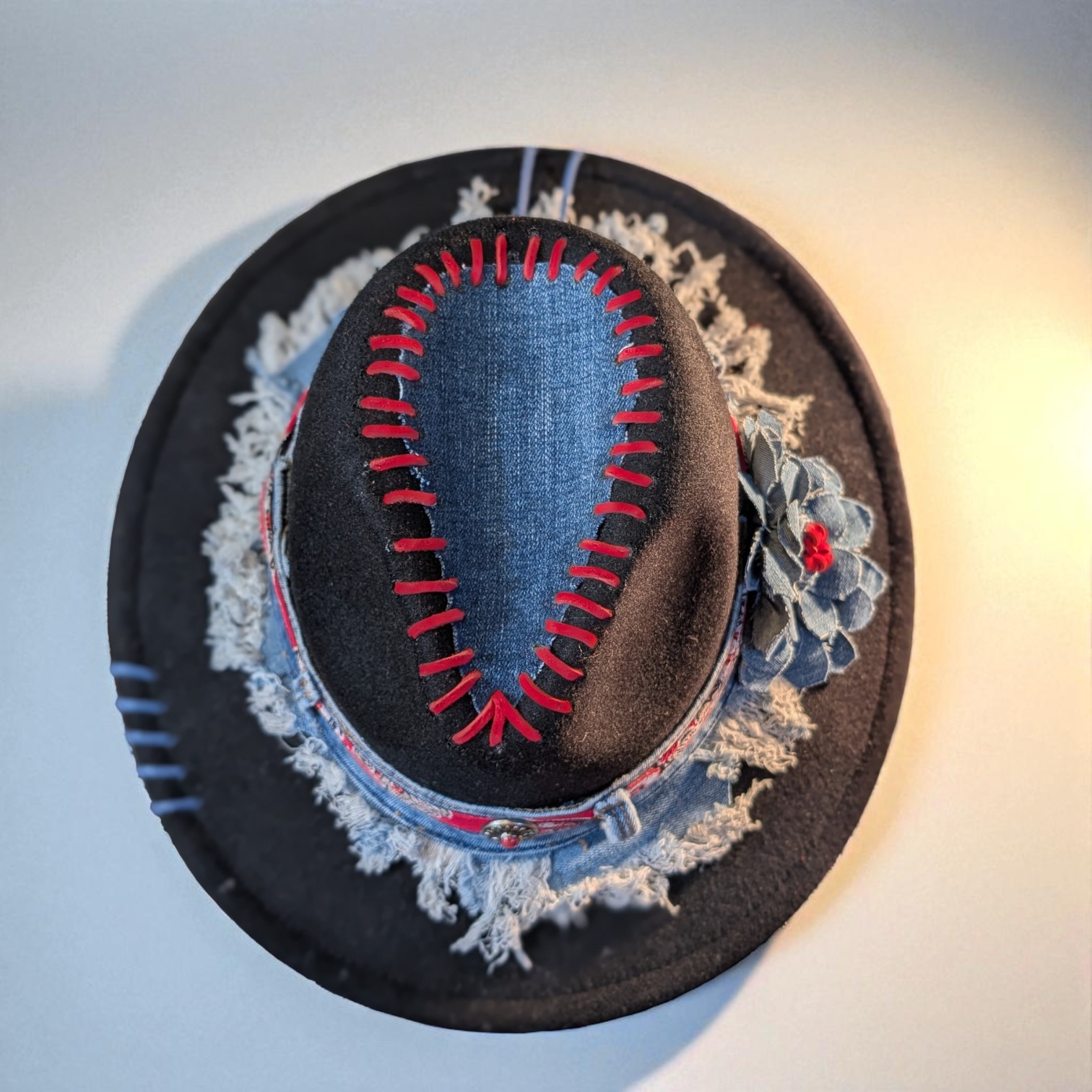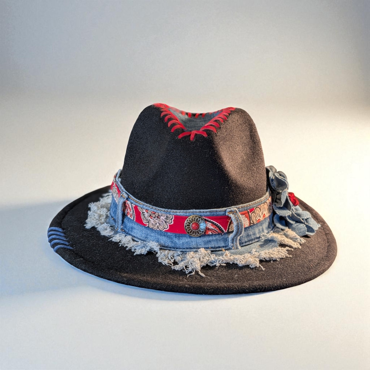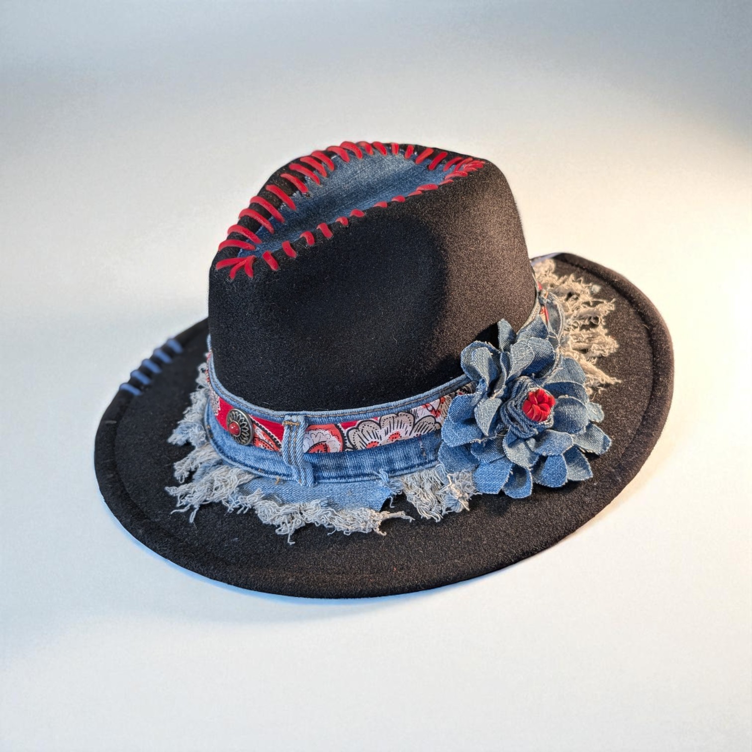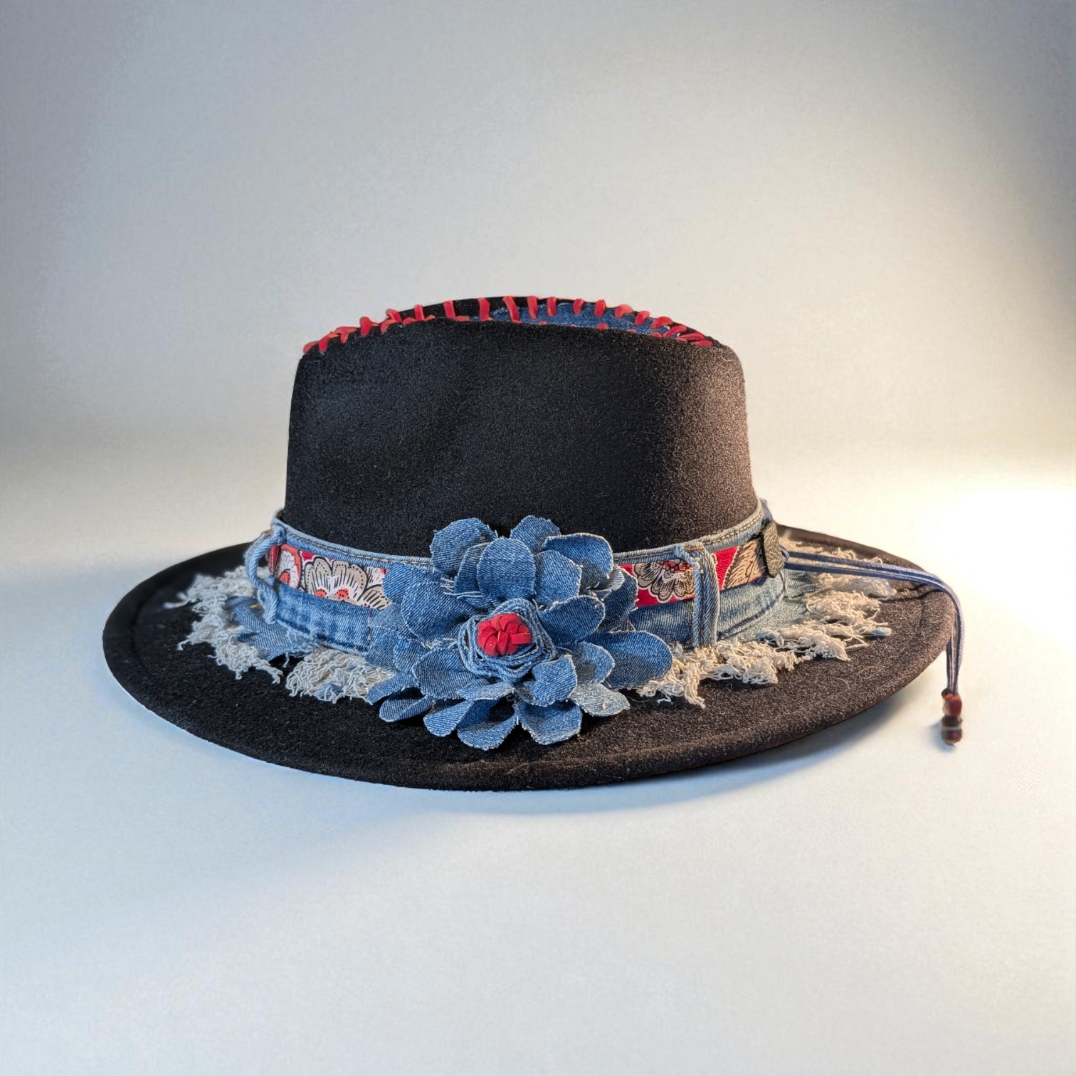 A hand crafted denim rose is featured on the unique black felt hat.  Frayed denim surrounds the crown on the brim, and red leather lacing encircles the top.  A belt like headband adds wonderful detail.