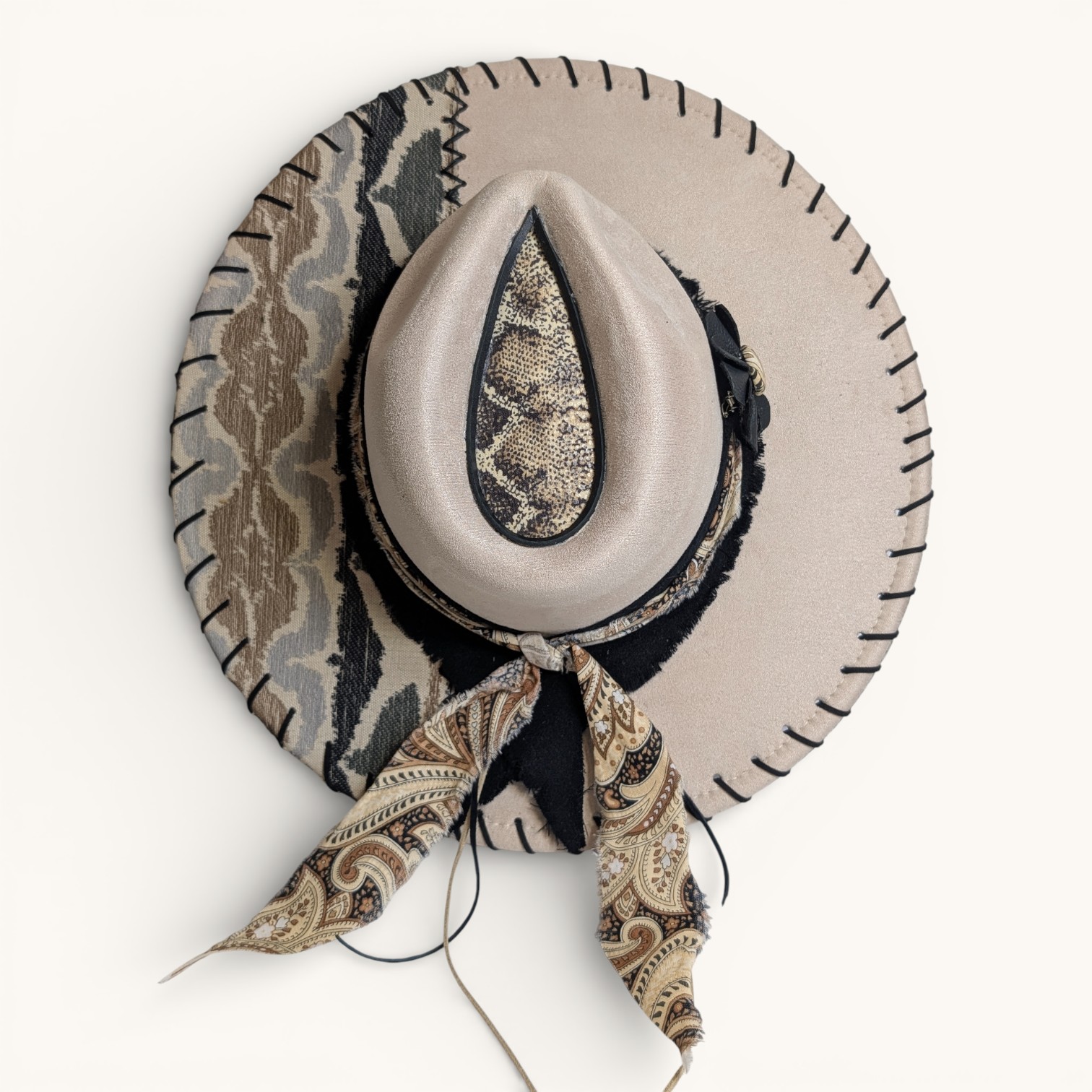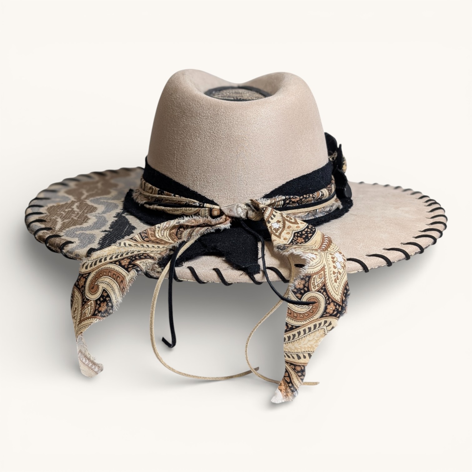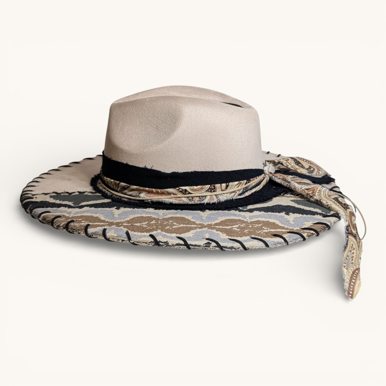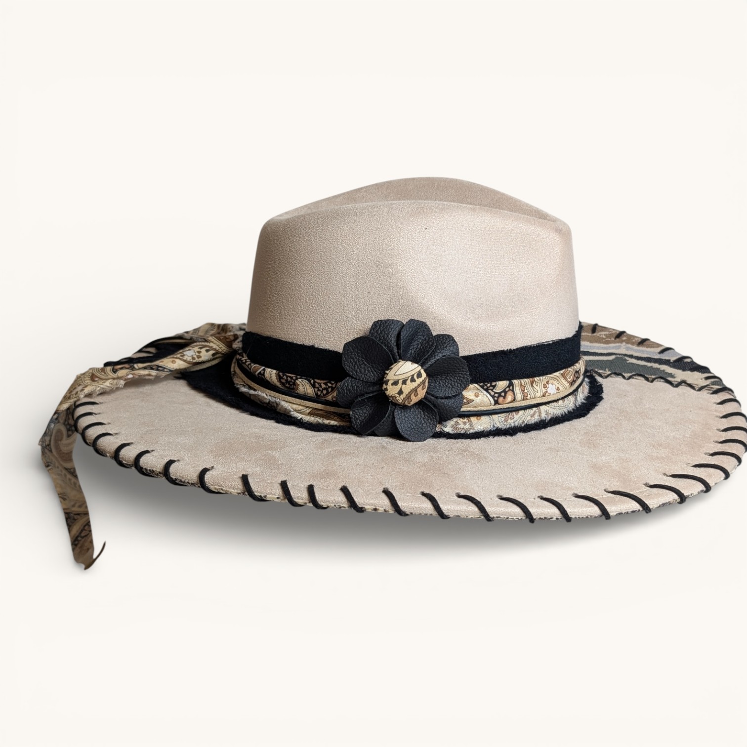 Discover the artistry of these uniquely embellished hats. These beautiful pieces of headwear feature one-of-a-kind designs crafted with a diverse array of fabrics, leather, rhinestones, lacing, gems, inks, paints, unique headbands, and feathers. Each hat is a masterpiece, as no two are alike! They are protected with a light matte varnish, a UV light blocker, and Scotchgard, making them not only stylish but also practical. Crafted from a durable cotton-poly blend, they not only provide warmth on cooler days but also offer refreshing shade when the sun is at its peak. Make a bold statement while enjoying comfort and protection year-round. Shipping is always FREE!!!