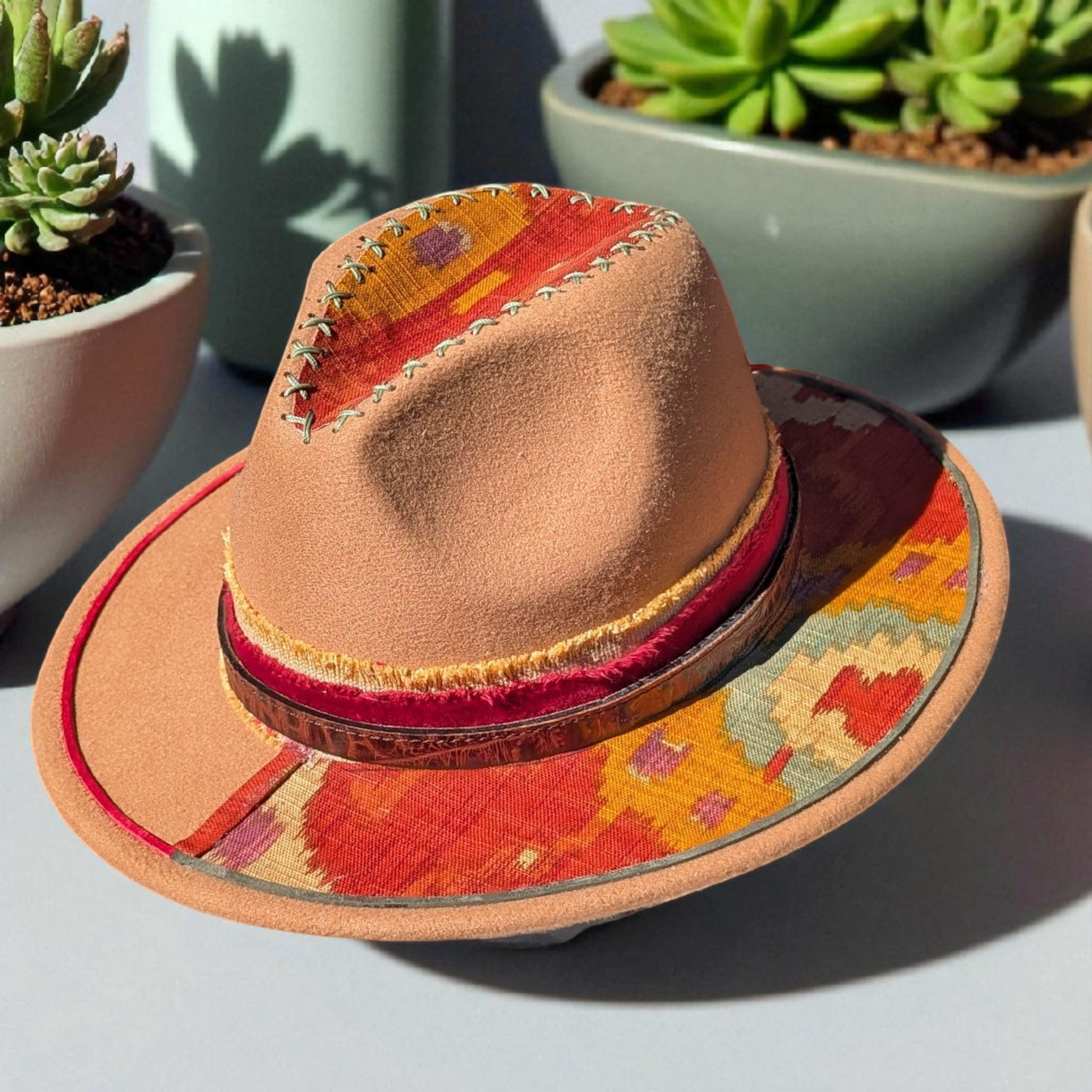 Discover the artistry of these uniquely painted and embellished felt hats. These beautiful hats feature vibrant colors and one-of-a-kind designs crafted with a diverse array of inks, paints, fabrics, leather, rhinestones, lacing, gems, and feathers. Each hat is a masterpiece, as no two are alike!  Every one is protected with a light matte varnish, Scotch Guard and/or a UV light blocker, which makes them not only stylish but also practical.  Crafted from a durable cotton-poly blend, they not only provides warmth on cooler days but also offers refreshing shade when the sun is at its peak. Make a bold statement while enjoying comfort and protection all year round.