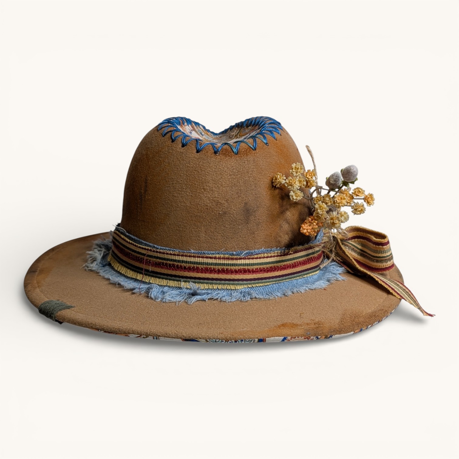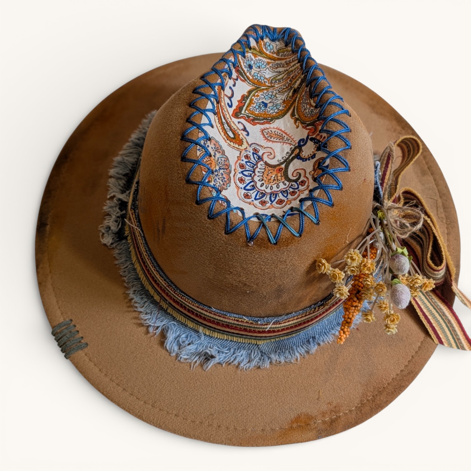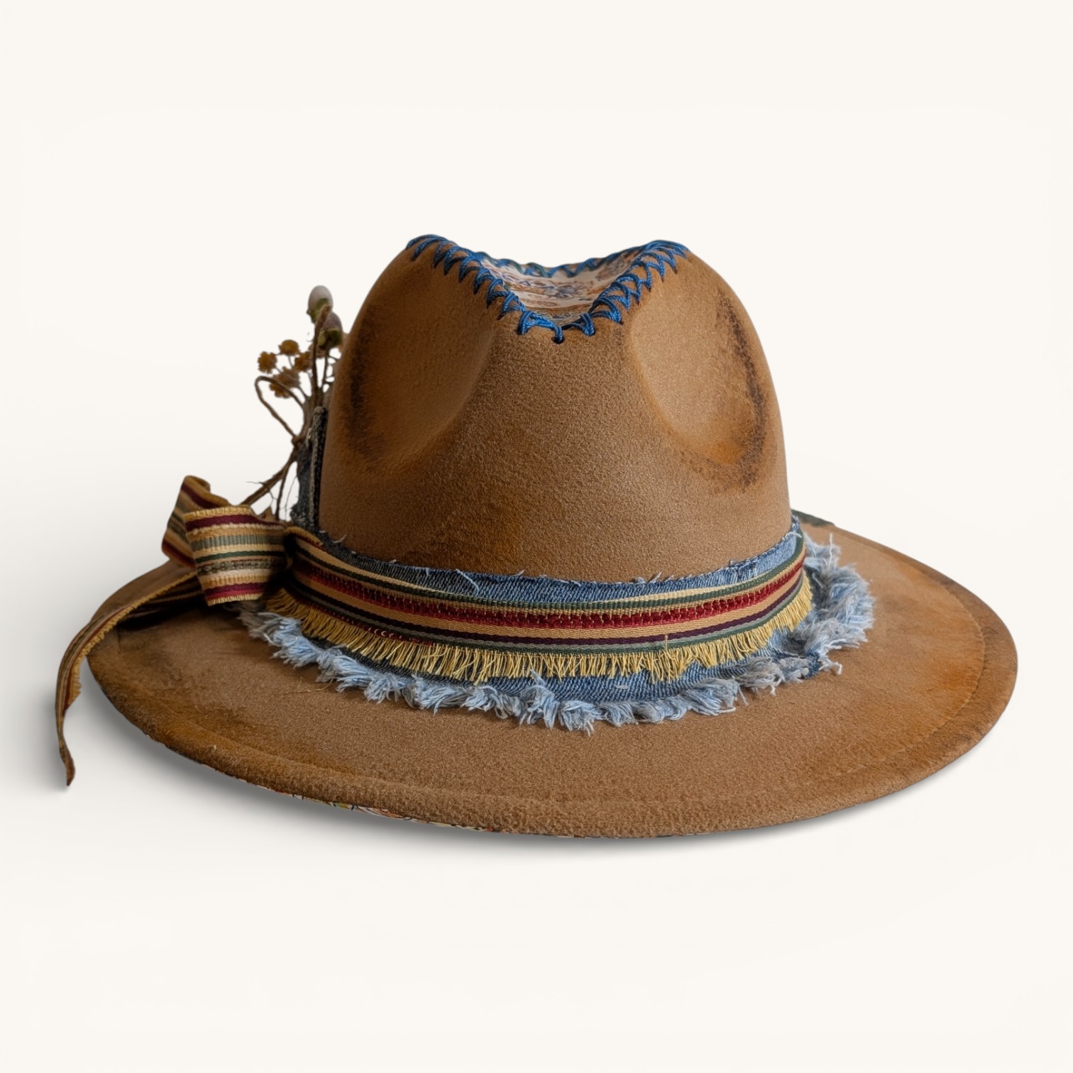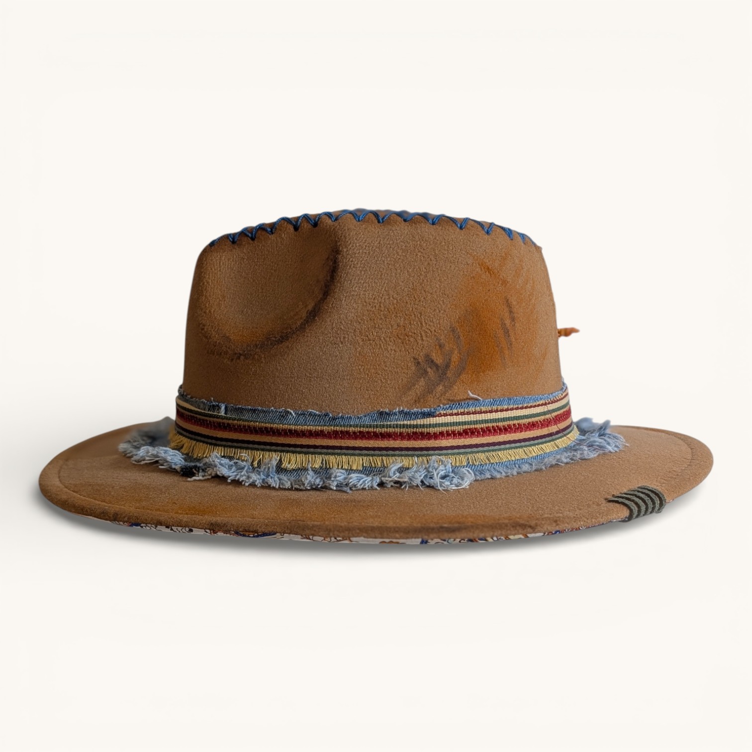 Discover the artistry of these uniquely hand-painted and embellished hats. These beautiful hats feature vibrant colors and one-of-a-kind designs crafted with a diverse array of inks, paints, fabrics, leather, rhinestones, lacing, gems, and feathers. Each hat is a masterpiece, as no two are alike! Each one is protected with a light matte varnish, a UV light blocker, and Scotch Guard, making them not only stylish but also practical. Crafted from a durable cotton-poly blend, they not only provide warmth on cooler days but also offer refreshing shade when the sun is at its peak. Make a bold statement while enjoying comfort and protection year-round.